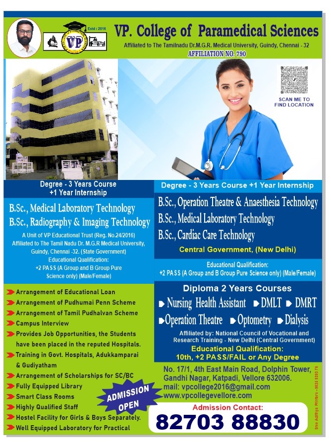 Our college is open to all students those who are willing to opt paramedical courses as their career. We would like to serve the society especially ailing people to get rid of the disease they are suffering from. We are very much conscious about the changing needs of the society.