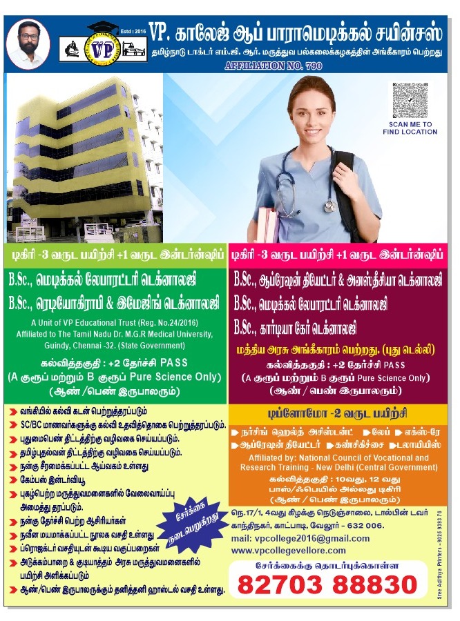 - It’s my sincere honor to serve as the vice principal of "VP. College of Paramedical Science".Since from the day of establishment our college has been striving towards maintaining high academic standards and excellence in the field of paramedical sciences. Our aim is to produce excellent and skillful professionals ready to serve the medical field with courage, compassion and devotion to duty. We are a team of dedicated teachers, giving our best to shape up the students in a better way by providing latest knowledge and skills that would help them to stand out in this fiercely competitive world. Our college not only focuses on the academic side but also help in the development of a student personality ,extracurricular activities and overall perspective. Everything that makes a good institution are –a highly trained faculty, rich library, placement division, teaching methods, liberty to think and express themselves-all we have it here. Our campus is vibrant with energy. I firmly believe that VP college of paramedical sciences is more than just a place to learn. It gives you chance to grow by equipping with everything you need to achieve excellence. I wish all the students a grand success in their career and prosperity in their future life.